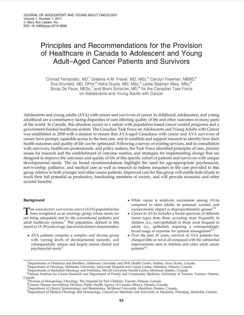 The Canadian Task Force on Adolescents and Young Adults with Cancer was established in 2008 with a mission to ensure that AYA-aged Canadians with cancer and AYA survivors of cancer have prompt, equitable access to the best care, and to establish and support research to identify how their health outcomes and quality of life can be optimized.